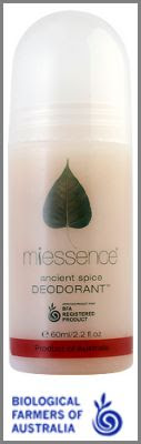 Miessence Certified Organic's Ancient Spice Deodorant. Effective bicarb of soda; lightly scented. No aluminium compounds making this a chemical free deodorant. RRP $9.60 AUD